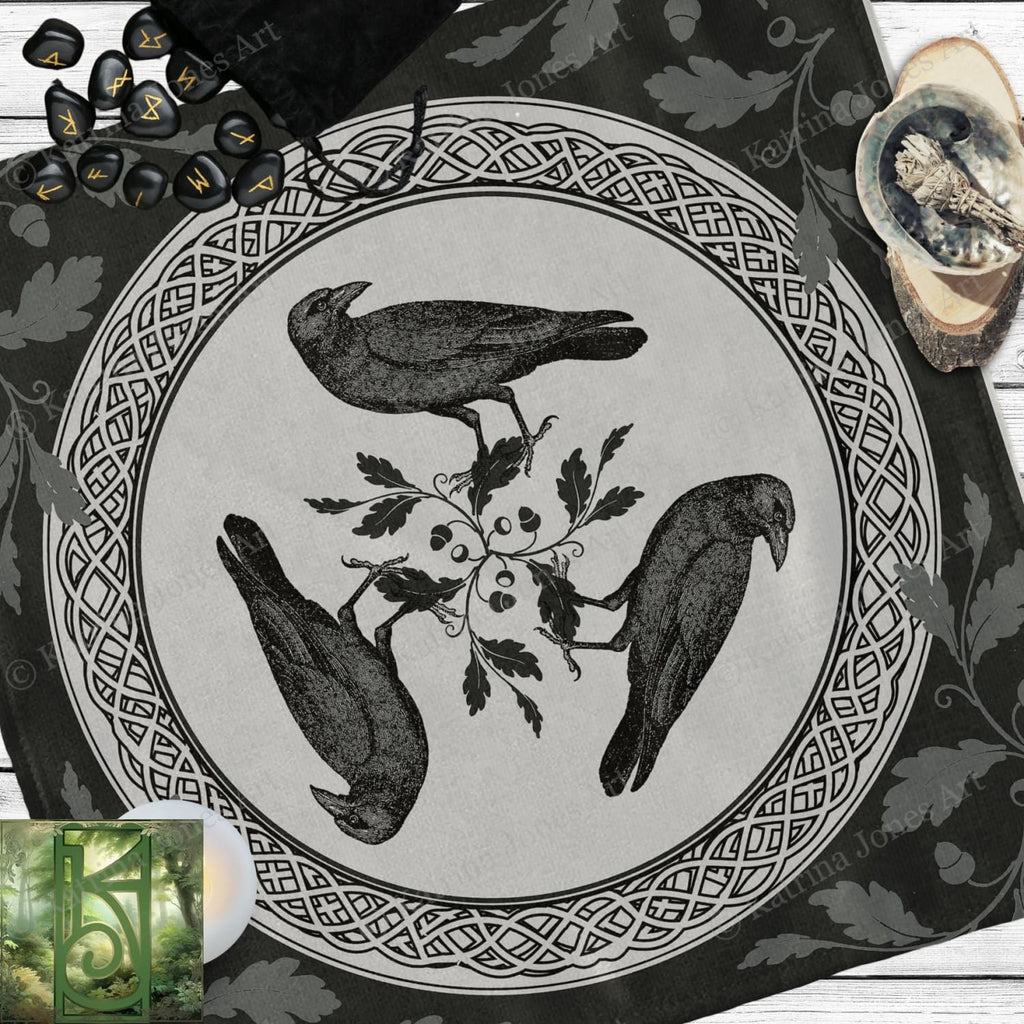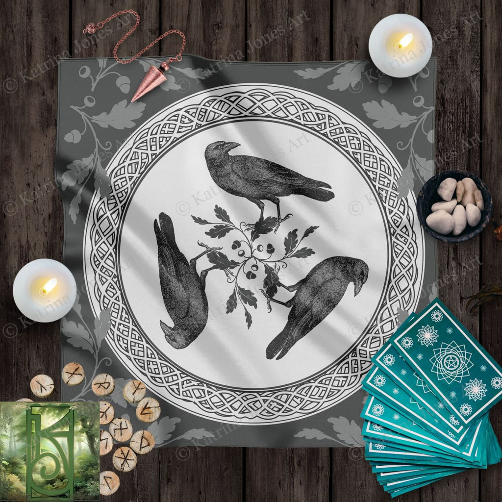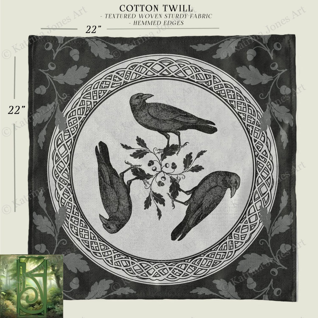 Celtic Triple Raven Square Altar Cloth Tarot Mat - Black