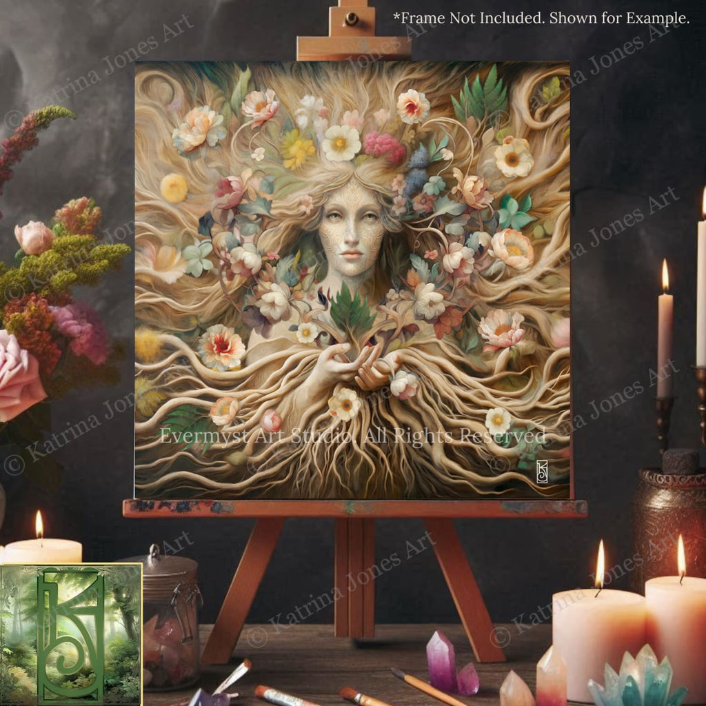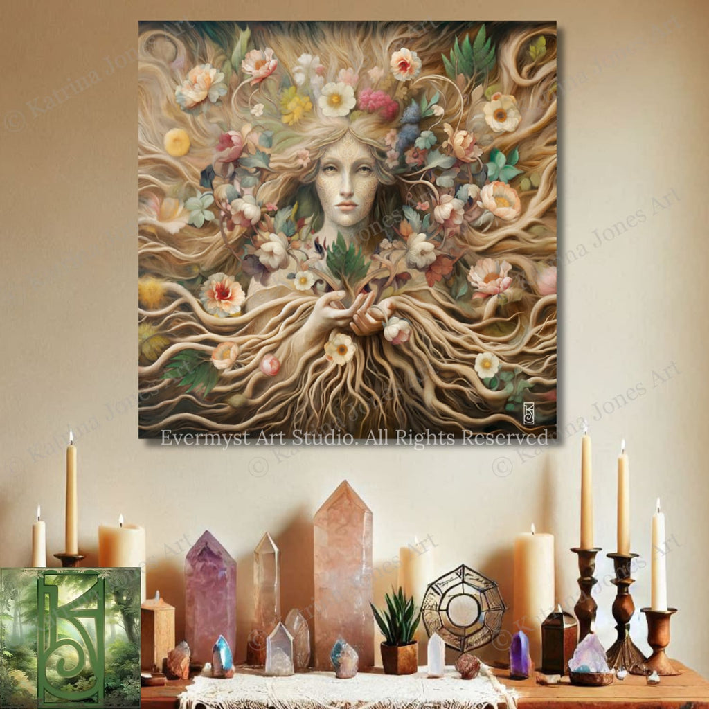 Embrace the ethereal beauty of this mystical nature goddess emerging from the twisting roots of an ancient tree. Inspired by Celtic lore, she stands as a guardian of the green world—earth-born, timeless, and sacred. Original Painting by artist Katrina Jones