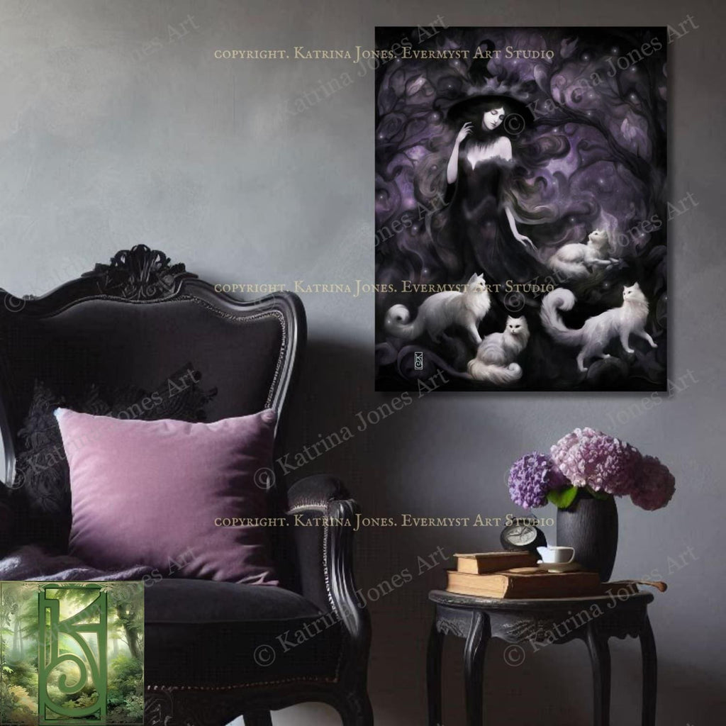 Nouveau Witch Wall Art , Witch Art work, Purple Witch Art , Witch and Cats Painting