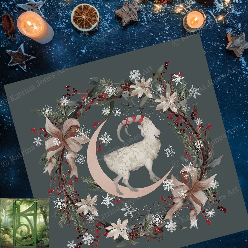 Yule Goat Moon Altar Cloth - Pagan Winter Botanical Decor Square