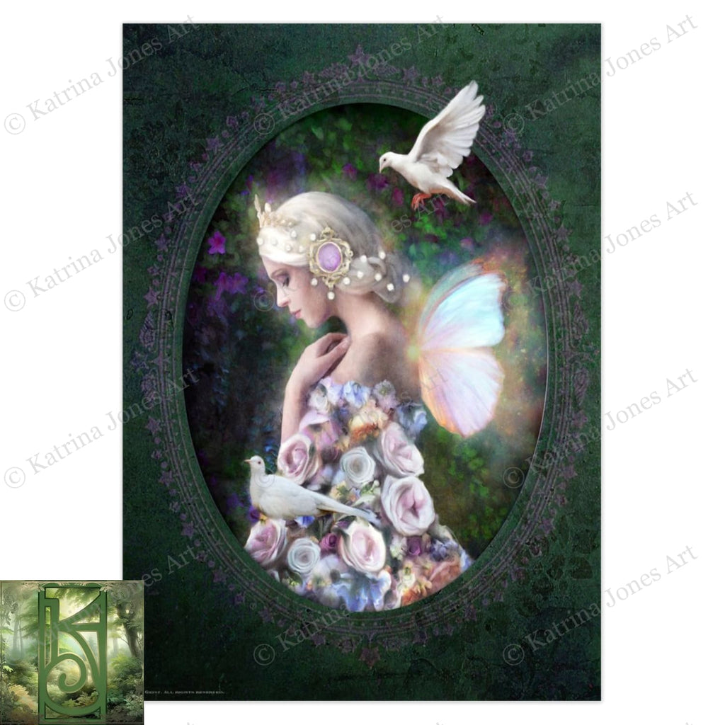 Dressed in soft pastel rose, blooms with jewels of rose quartz. She, along with her two white doves bestow soft whispers of encouragement that weave their way into the soul like wisps of love and light.
