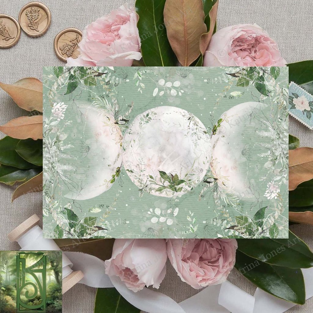 Share the power and glory of the Goddess with this beautiful card. Representative of all aspects of the divine feminine power – intuition, psychic insight; creative energy, wisdom, mystery - this is the Wild Green Garden triple moon, adorned with greenery and flowers, and other botanical elements celebrating the season of Spring and everlasting life.
