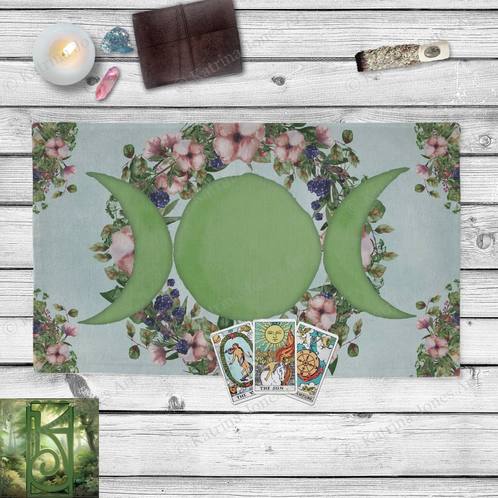 The altar cloth tarot mat from Evermyst Art Studio features a summer fruit design with the triple moon symbol, crafted from thick cotton fabric to enhance your spiritual altar and tarot reading cloth needs. This 18 x 30 inch decorative tapestry serves as a durable and beautiful foundation for your sacred ritual cloth, creating an inspiring space for meditation, oracle readings, or Wicca altar decoration.
