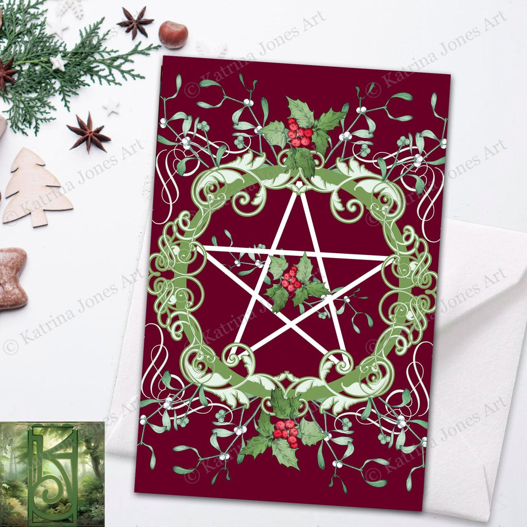 An ornate pentacle design is featured on this card, adorned with mistletoe leaves and berries, in traditional Yule colors of red, green, and white. Spread your holiday Winter Solstice season blessings and the balance and harmony of the elements represented by the Pentacle symbol